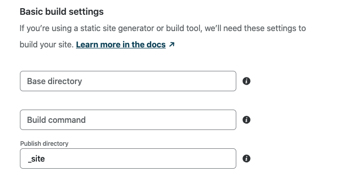 The build settings for our project will have no Build command and will specify _site or _book (as appropriate) for the Publish directory: