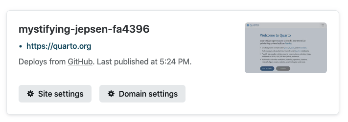 Now, commit and push your modified project (including _freeze, netlify.toml, and package.json). Assuming that you configured the project correctly in the previous step (i.e. Publish directory set to the _site or _book directory) then Netlify will begin rendering and publishing your site each time you push a new commit.