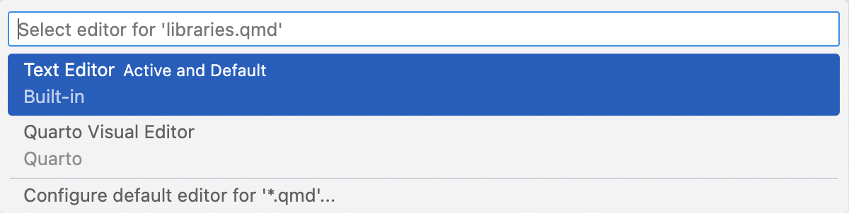 Note that this menu also provides an option to configure the default editor for .qmd files: use this if you want to primarily edit in visual mode and occasionally switch to source mode.