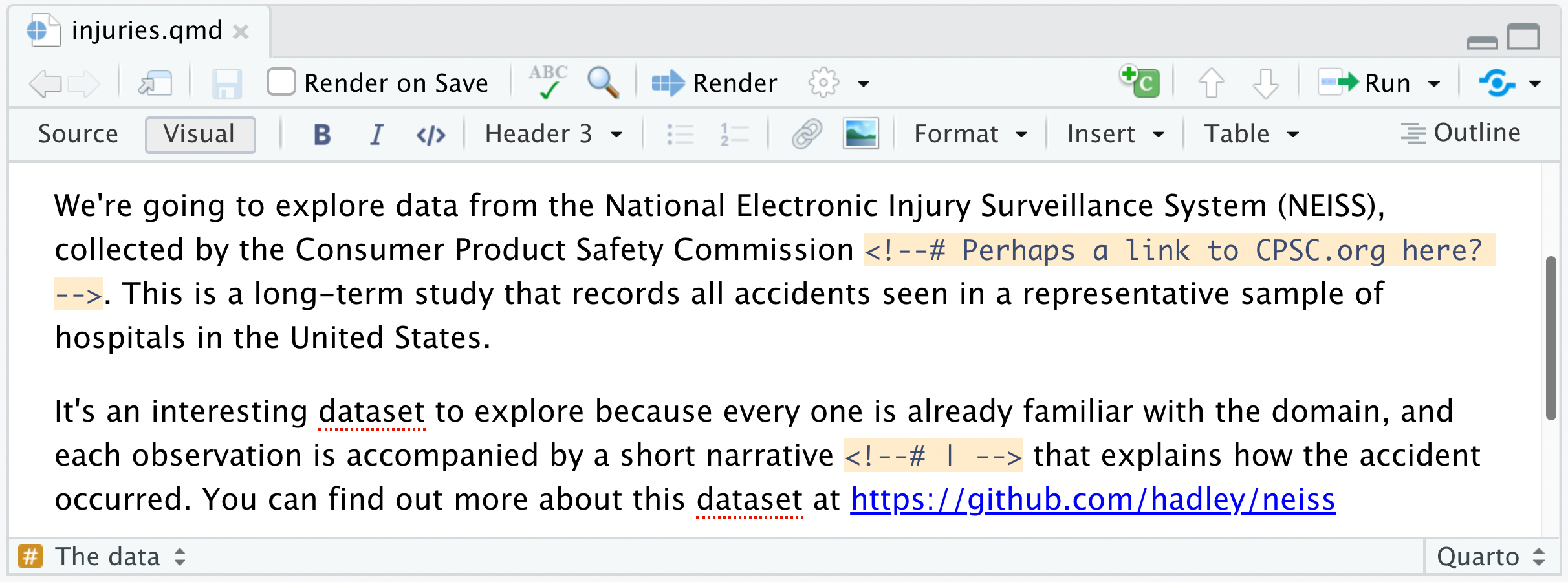 When reviewing a document you often want to provide inline comments with suggested revisions. This is possible in Quarto using HTML comments (which are ignored by all output formats). Visual mode includes a command for inserting HTML comments as well as special highlighting treatment to easily parse out editing comments from surrounding text.